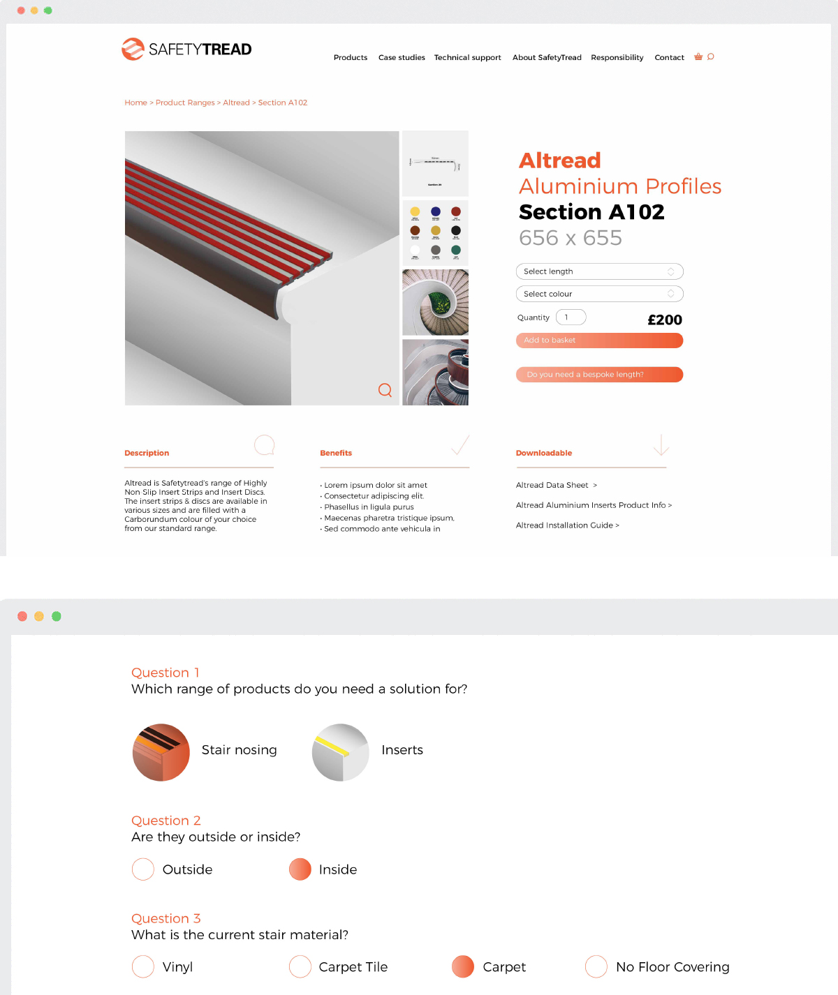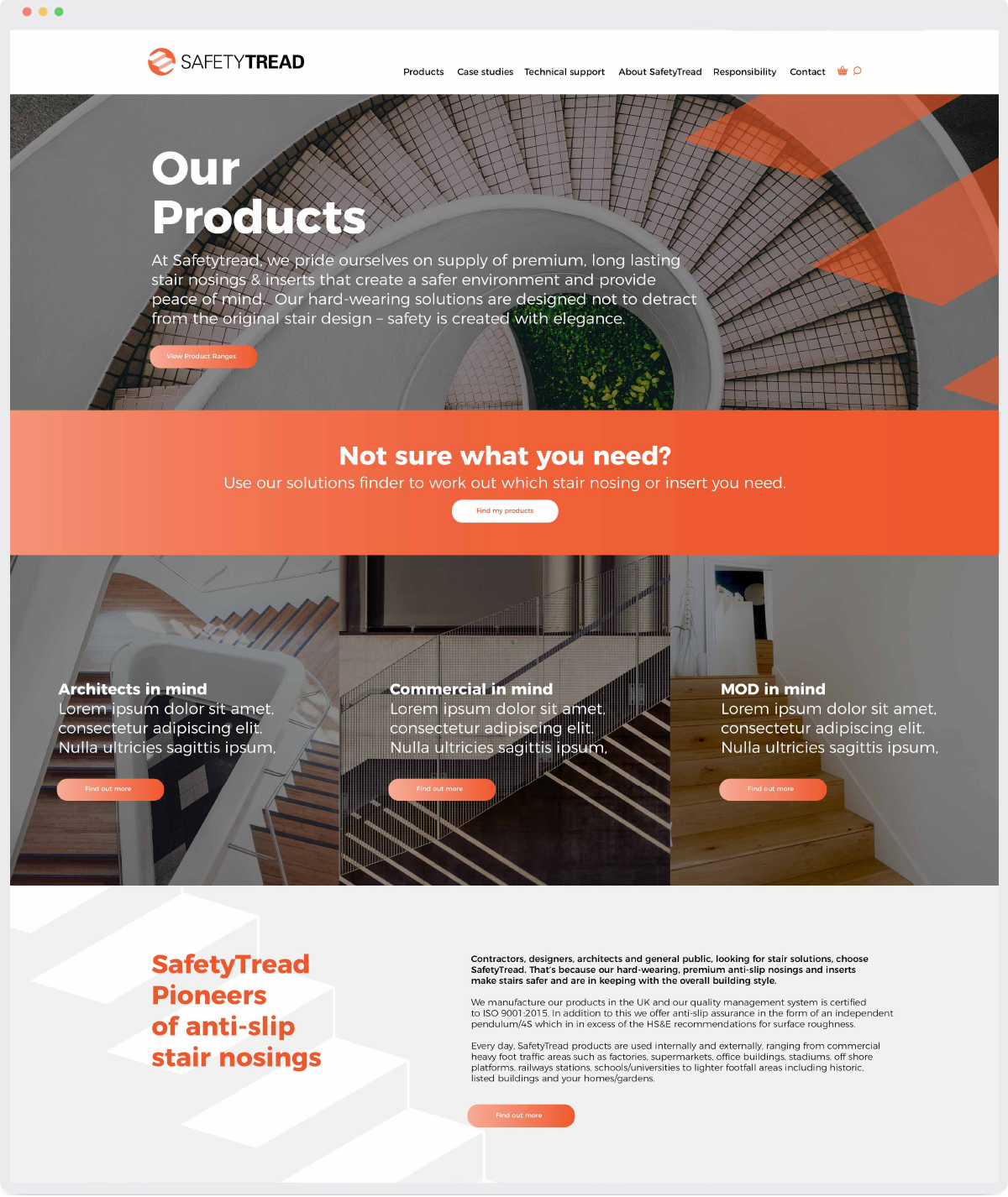 SafetyTread have a range of products which are often hard to visualise and who’s benefits are often left undersold. Our task was to explain the sectors each item could be used for and why each was the ‘right’ choice. After developing the brand foundations and refining the brand look and feel we moved on to creating a bespoke ecommerce site. Products were digitally visualised to ensure maximum clarity and a ‘solution finder’ created meaning the customers got to a suitable product quickly and easily.