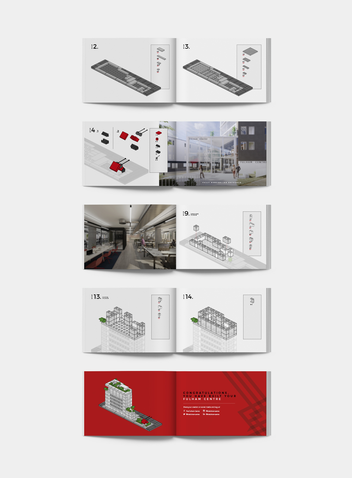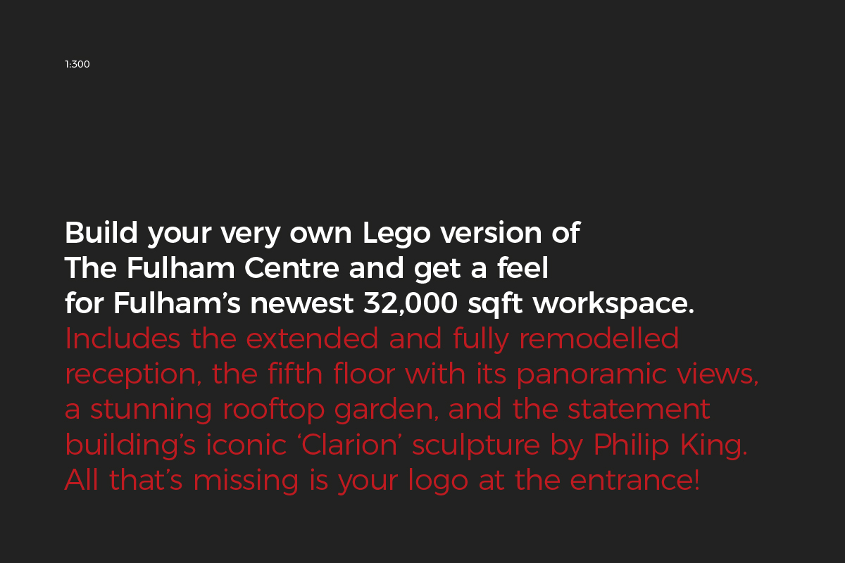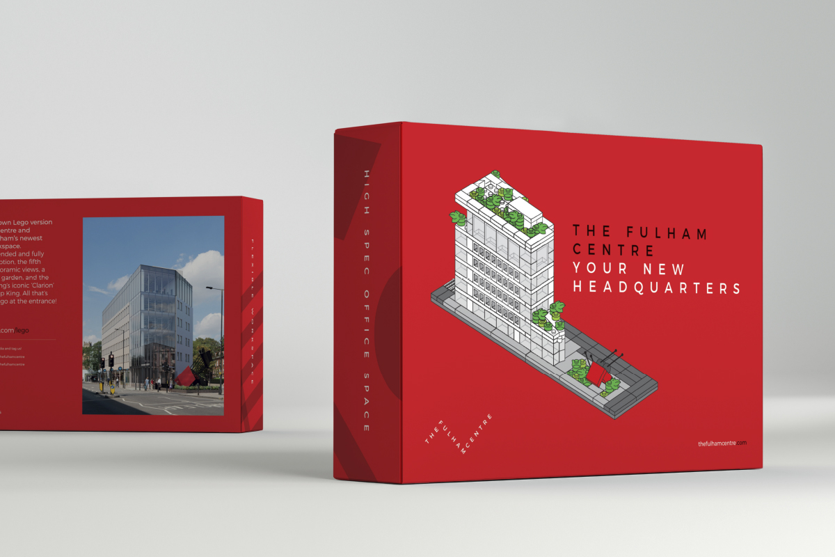 The Fulham Centre is in the making and beginning to look the part. Next step is to find a long term tenant for the whole building. Working closely with the team at Romulus we wanted to find a way to ‘get to the right people’ and get them to truly engage. After a lot of Lego sessions (with some help from the younger generation) and over 16,000 pieces separately ordered, we created a bespoke model to closely represent the ‘all new’ Fulham Centre. A set of accurate instructions were also created with visuals of the new building dropped in. It’s a 3D invite for people to create their new headquarters!